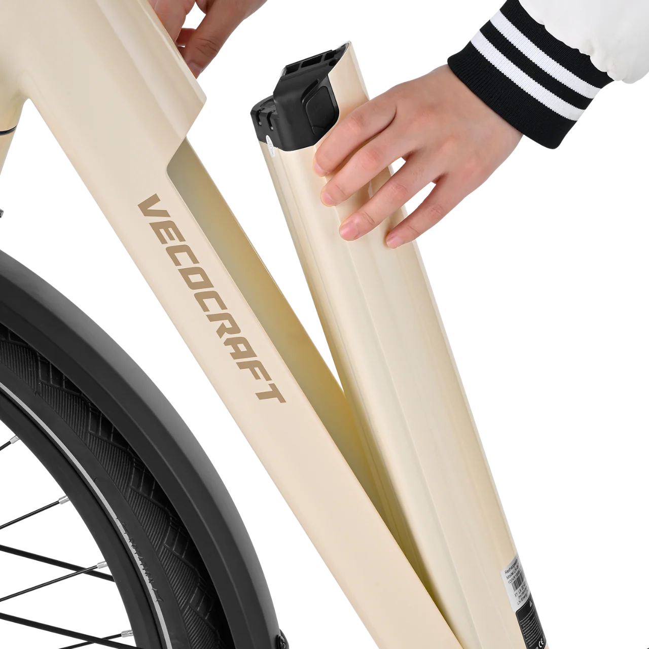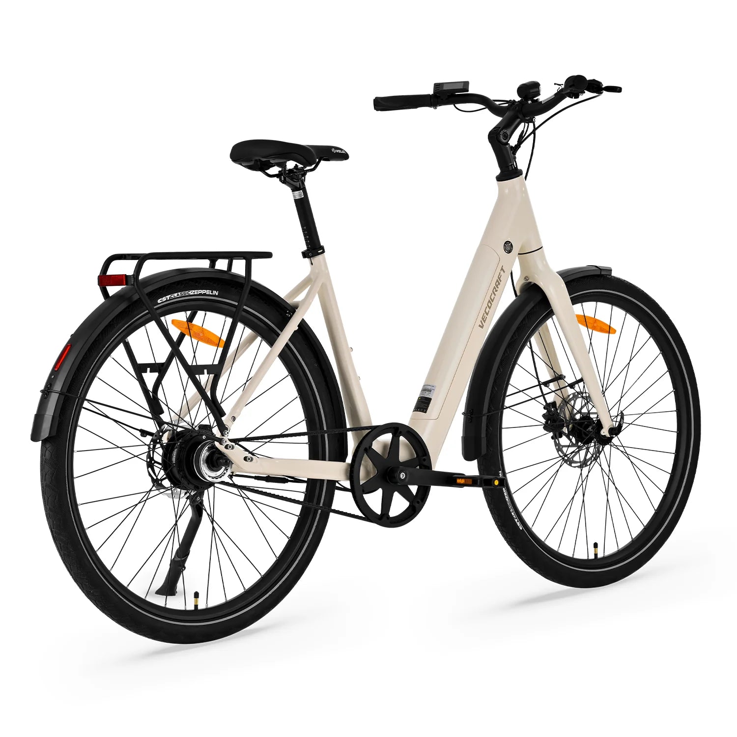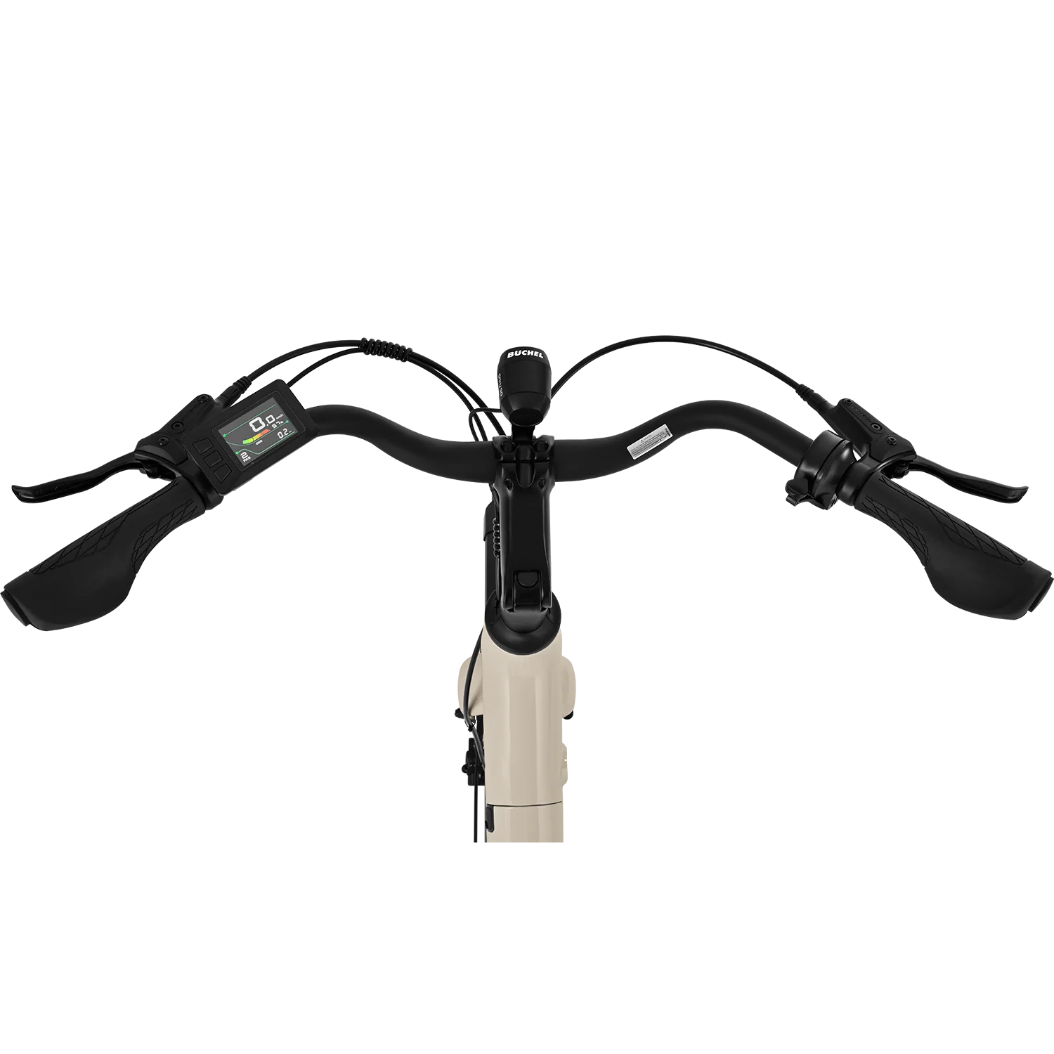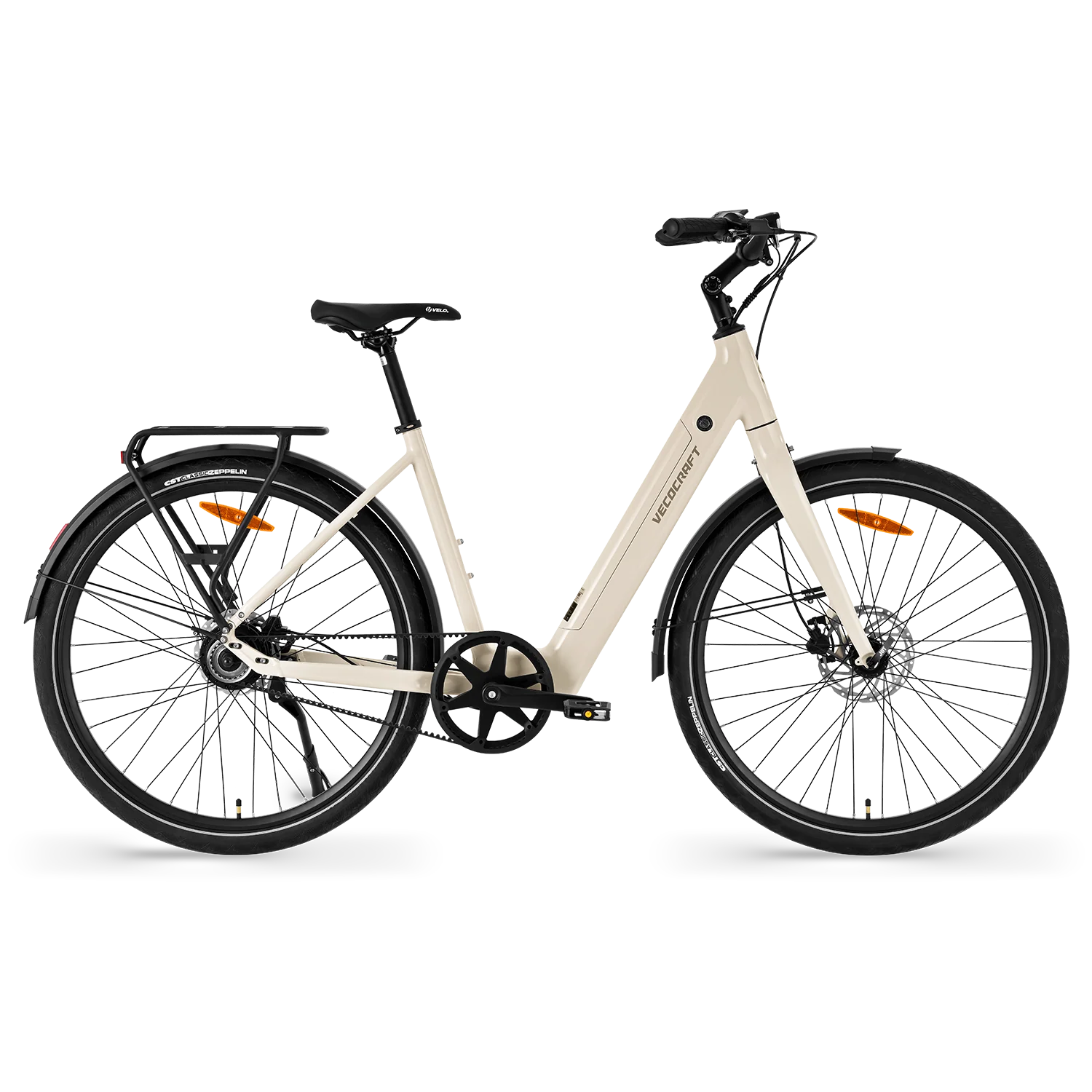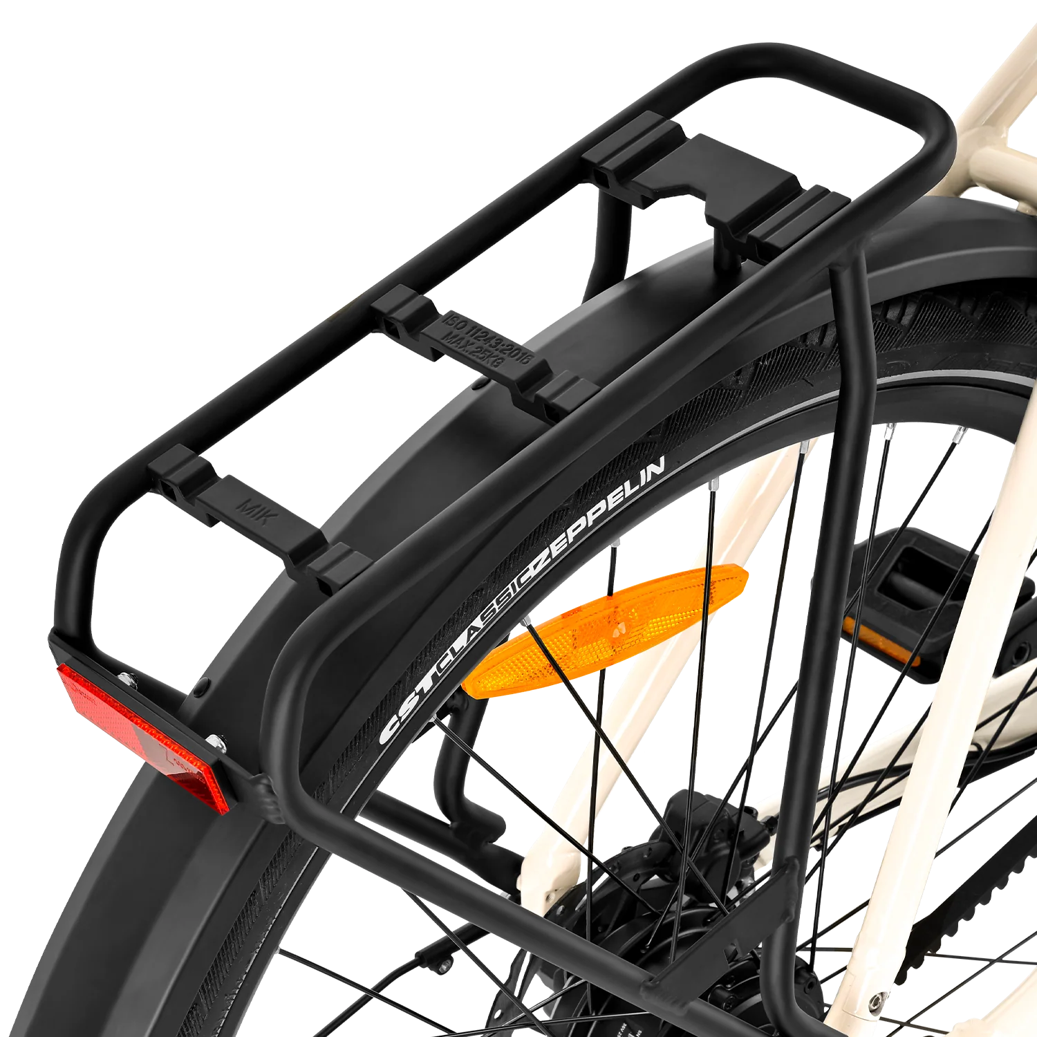 Rammen er konstrueret i let aluminium med en geometri, som fokuserer på oprejst og afslappet siddestilling. Denne position giver dig et godt overblik over trafikken, gør start og stop lettere – og hjælpe dig med at ankomme friskt, ikke svedig. Den sandhvide farve giver et rent og roligt udtryk og passer perfekt ind i moderne bymiljøer og boligområder.