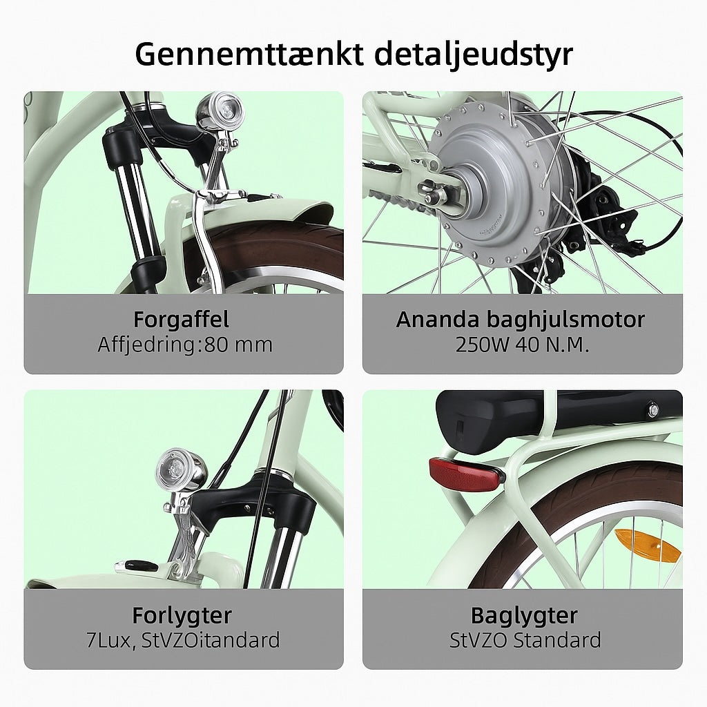 En af de store styrker ved Hebe er dens kraftfulde og velbalancerede drivlinje. Motoren er en Ananda 36 V / 250 W centermotor (mellemmonteret) – hvilket giver optimal vægtfordeling og en naturlig fornemmelse ved kørsel.